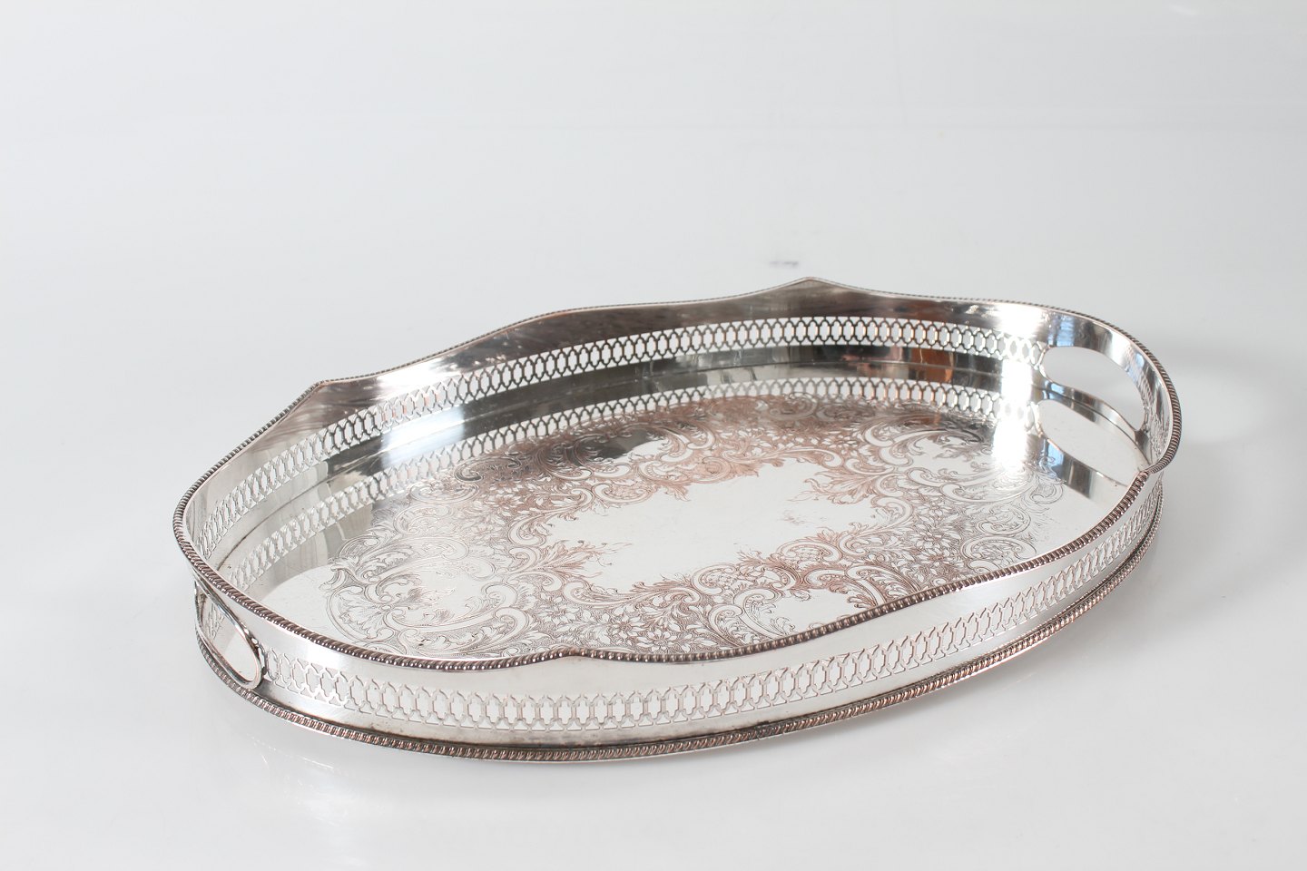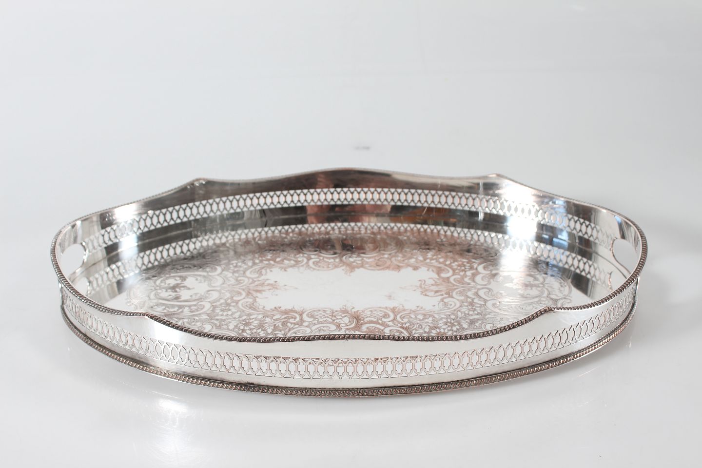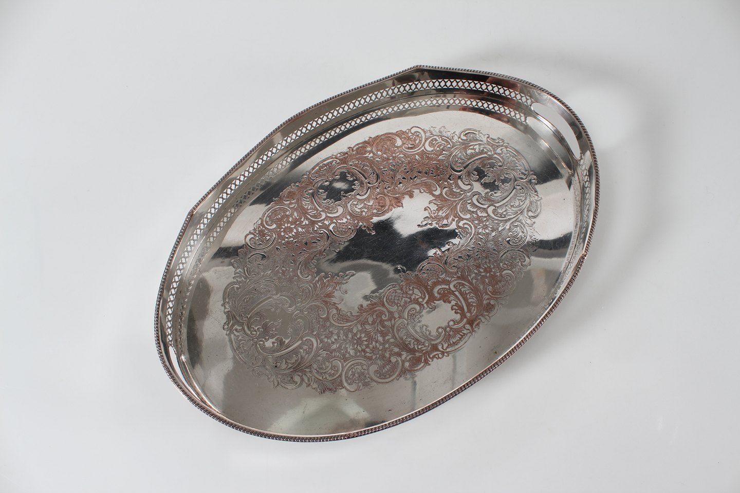 English Silver Large oval silver-plated serving tray with handles Made in England circa 1900 Length 45 cm Width 31 cm Height 5 cm Nice vintage condition with patina
