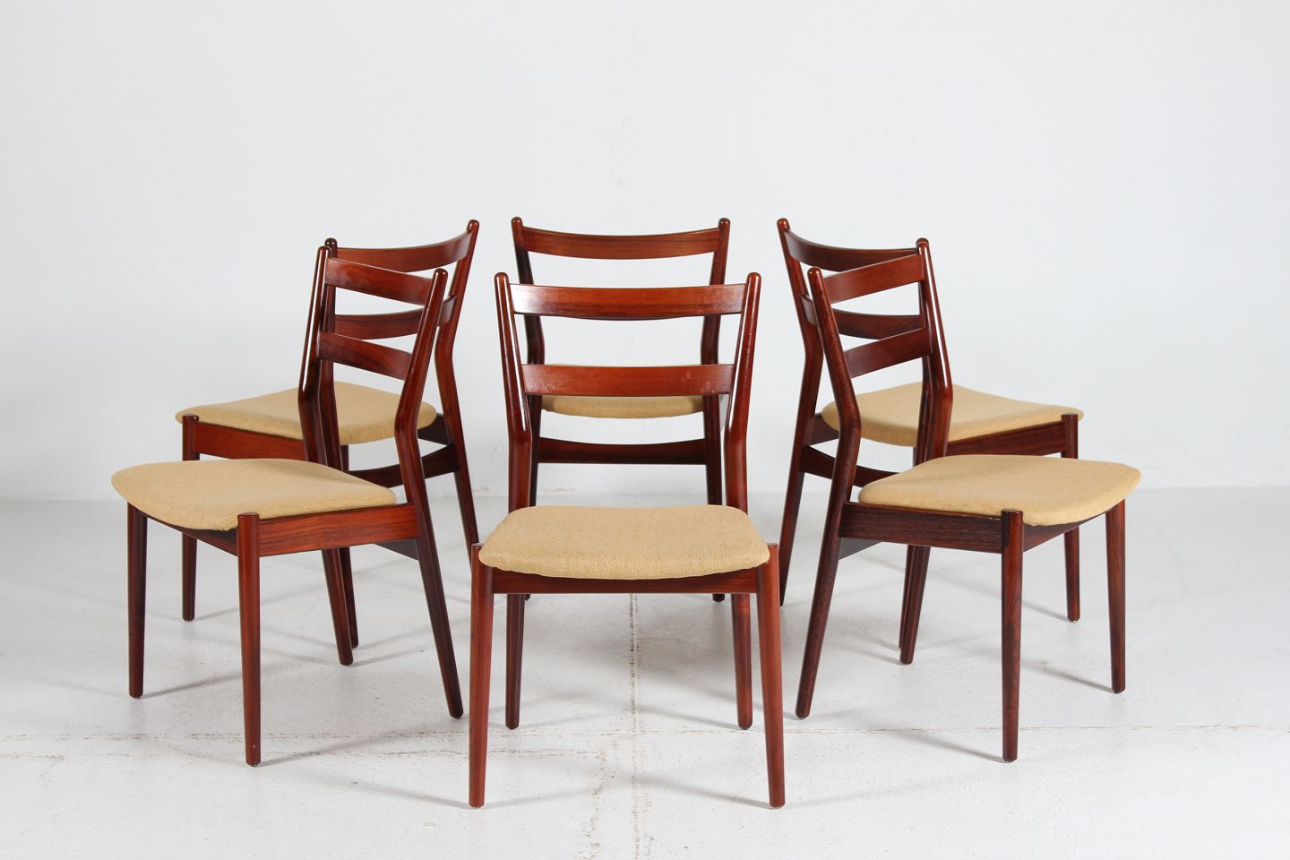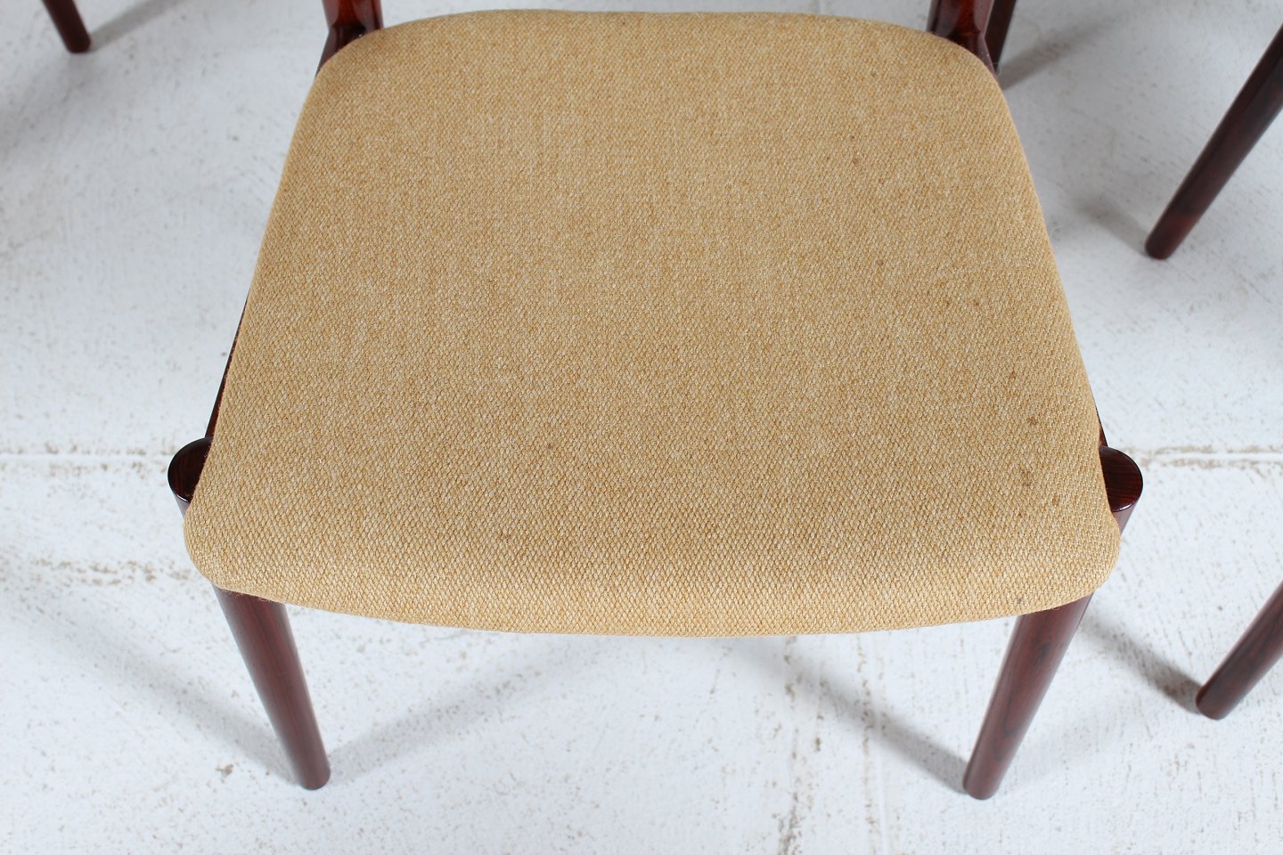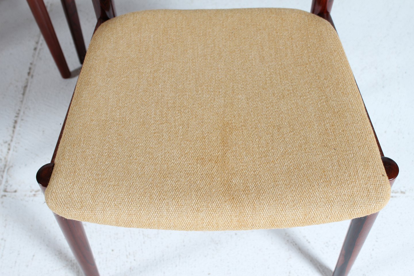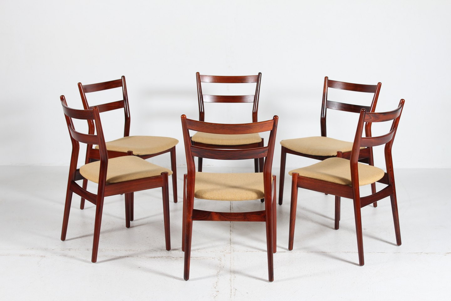 Helge Sibast (1908-1985) 6 dinning chairs model 59 made of rosewood with seats of light colored wool Manufacturer: Sibast Møbler Height: 81/43 cm Width: 48 cm Depth: 51 Nice vintage condition after normal use
