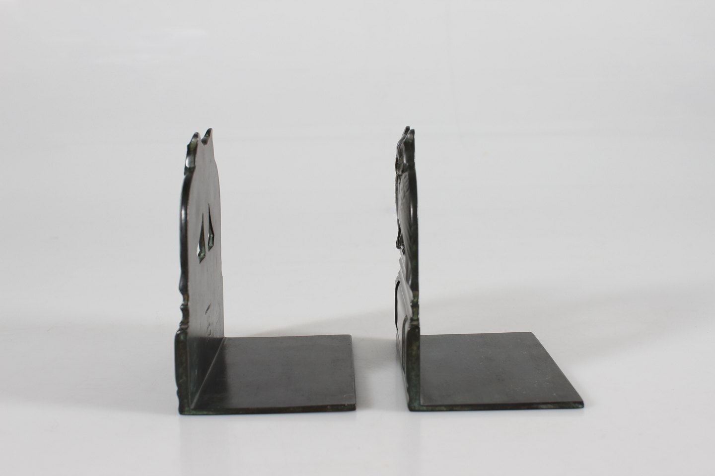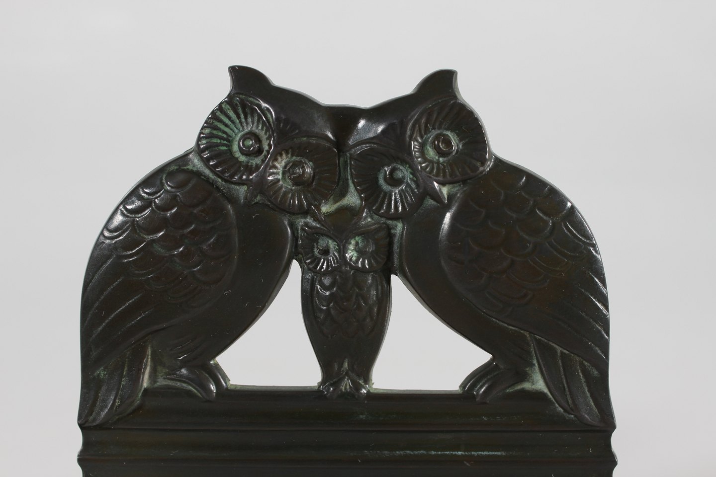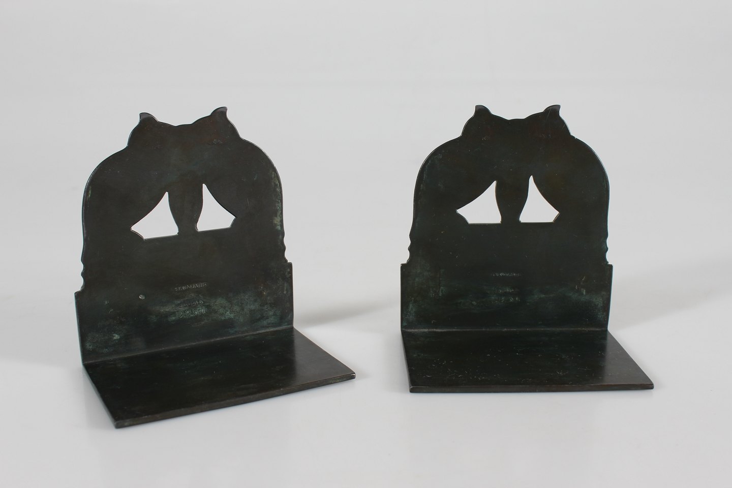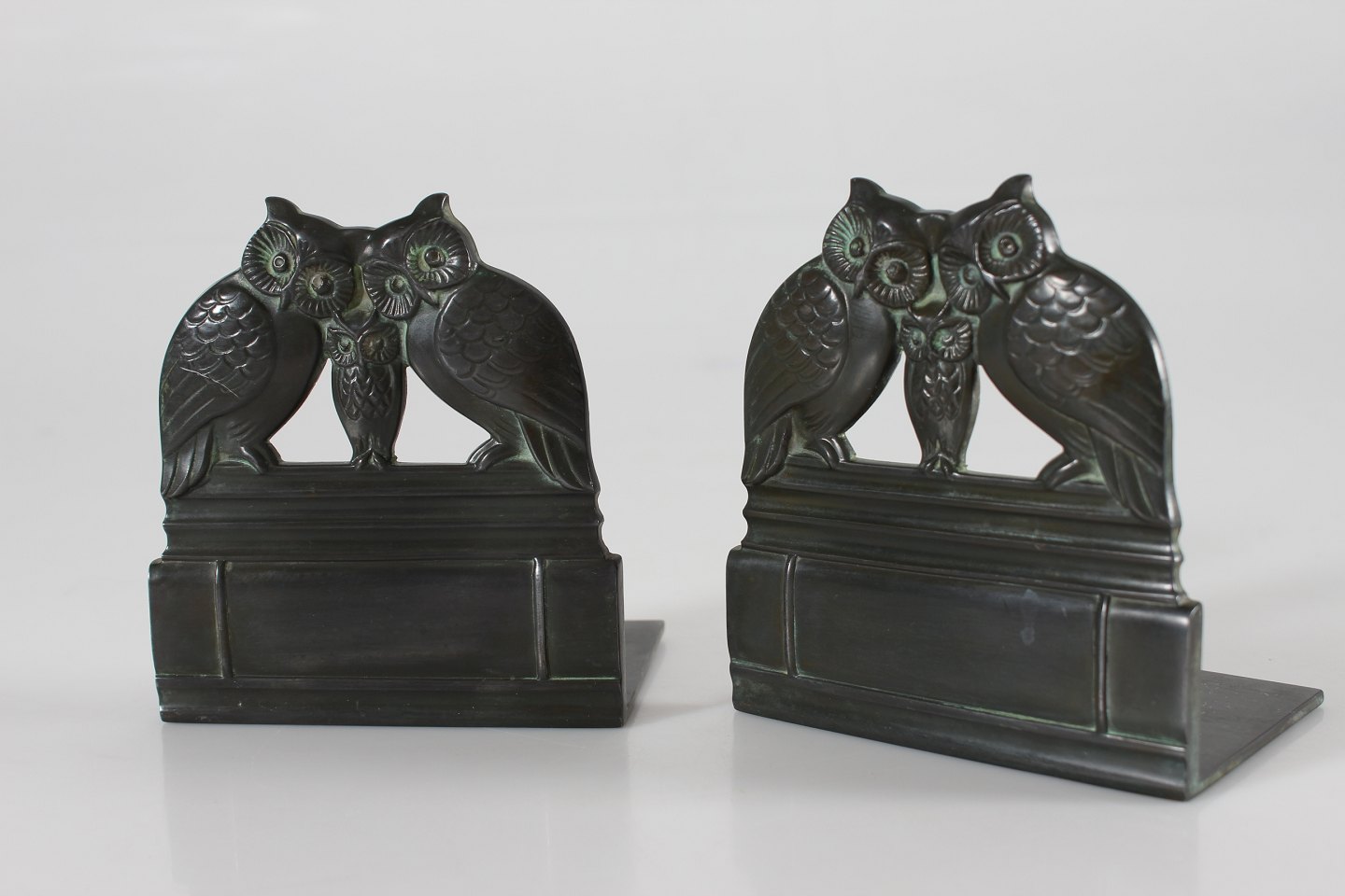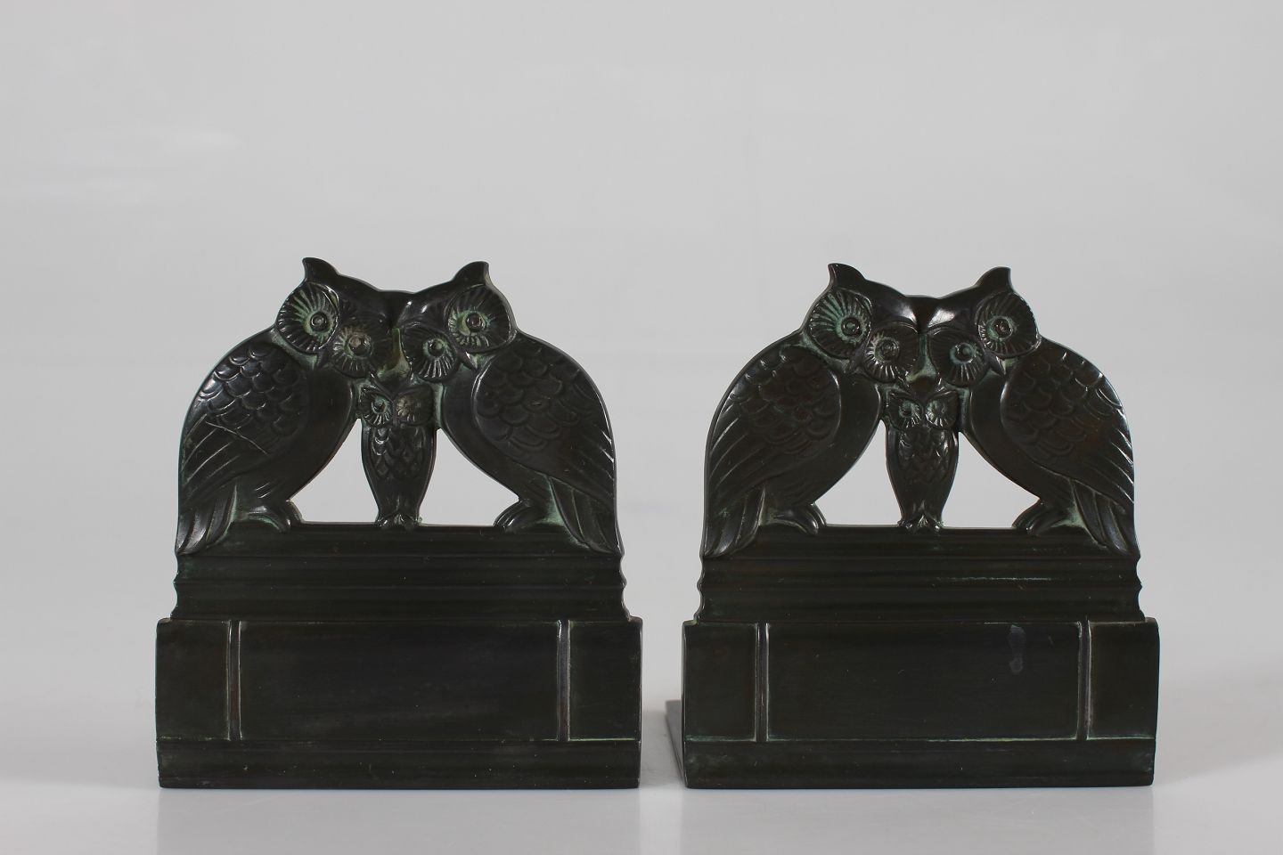 Just Andersen (1884-1943) Set of two bookends with owls Dessin no. 2254 Made of disco metal with patina Sign. monogram for Just Andersen Height 10,5 cm Length 10 cm Width 6.5 cm Nice vintage condition with good patina