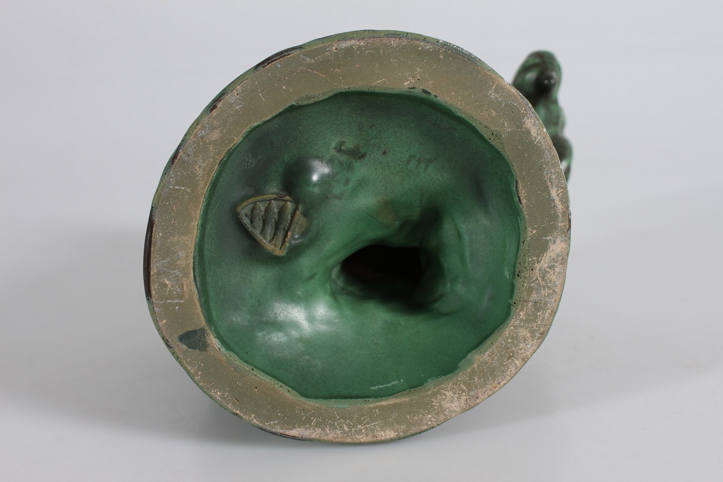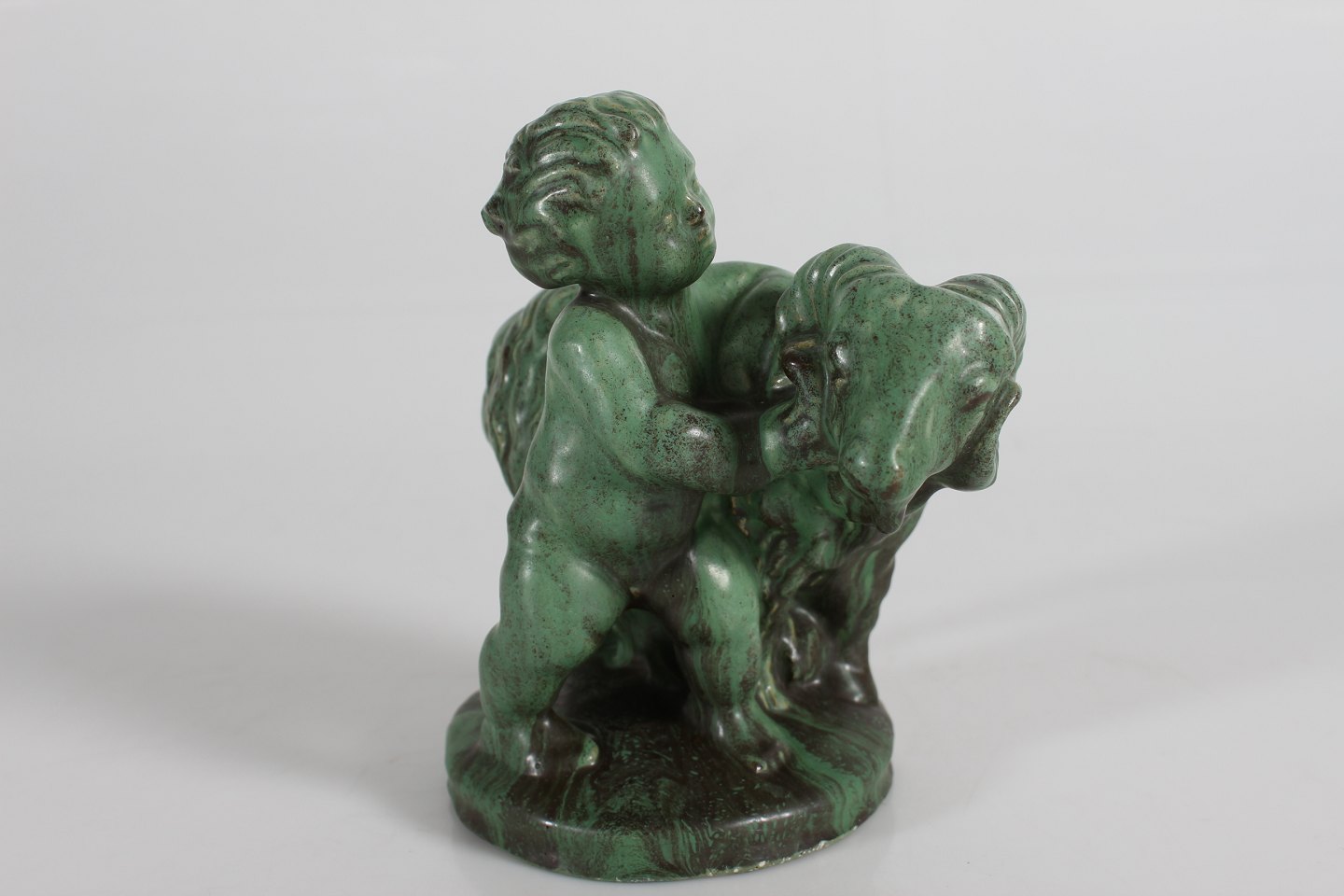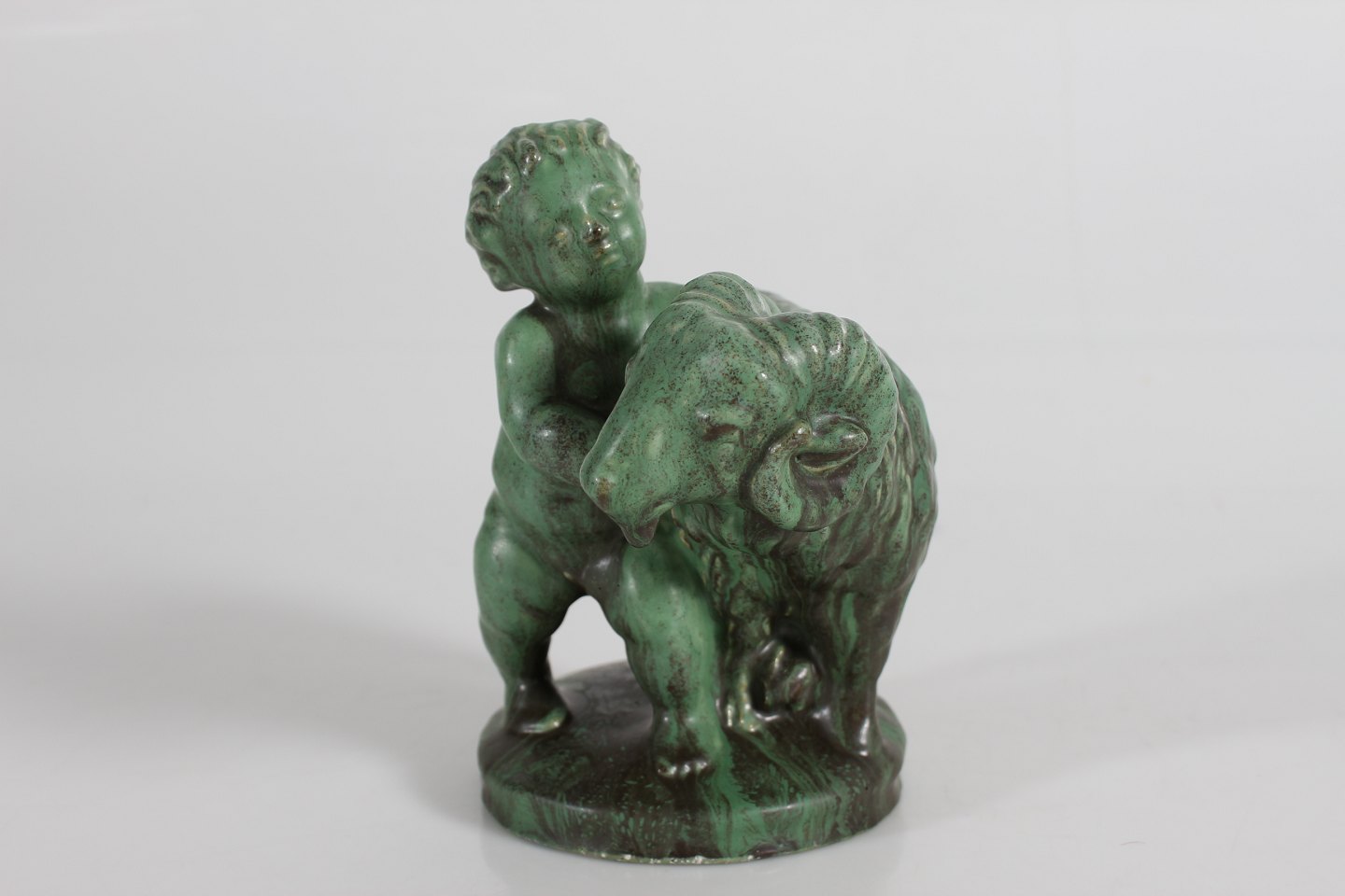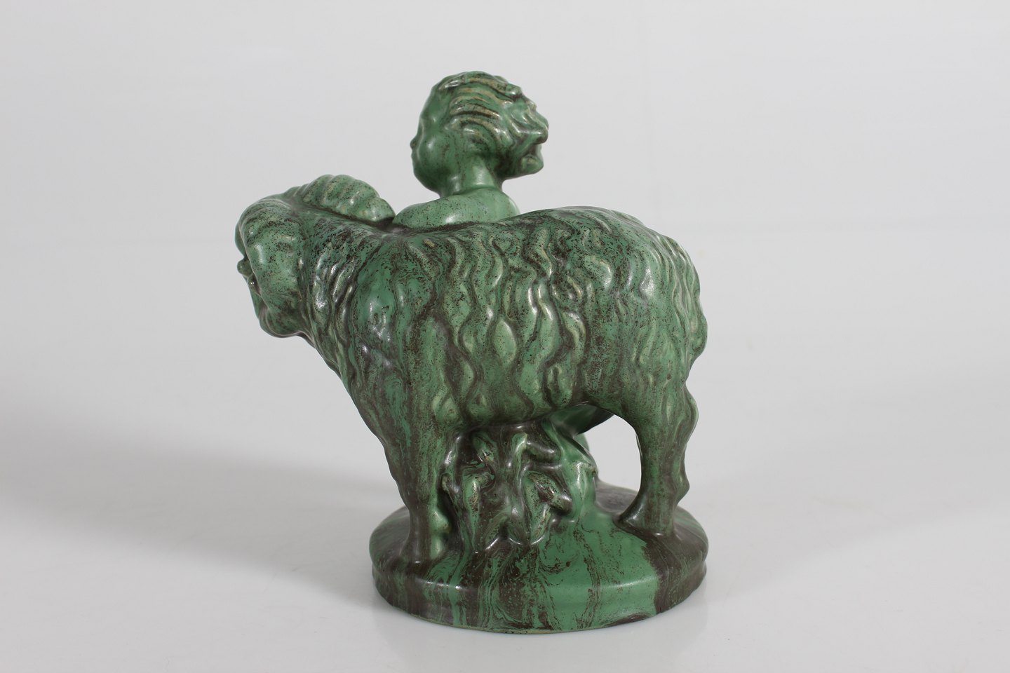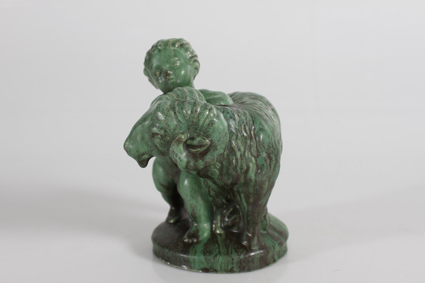 Michael Andersens Keramikfabrik - Bornholm Boy with ram most likely by Daniel Andersen decorated with matte verdigris green glaze Height 17 cm With logo for Michael Andersen Very nice vintage condition - no chips or cracks
