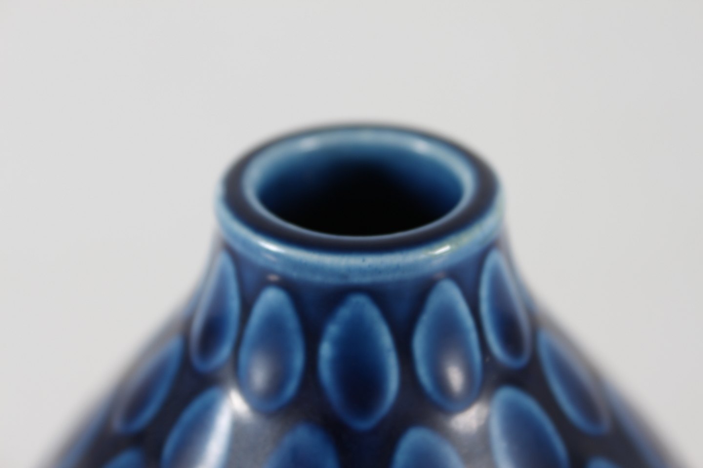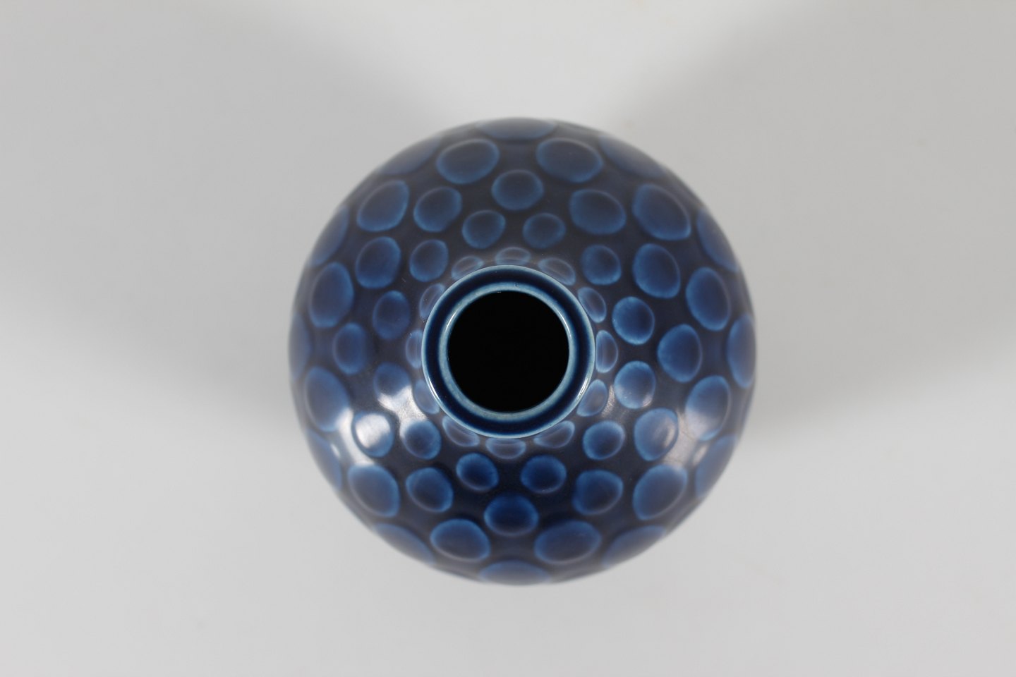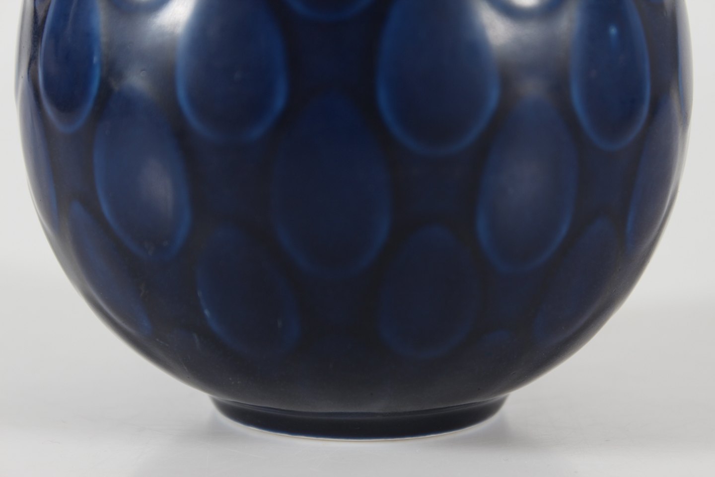 Royal Copenhagen + Nils Thorsson (1898-1975) Drop-shaped vase no. 2633 with geometric pattern decorated with blue glaze sign with logo for Nils Thorsson Height 13,5 cm Diameter 10 cm Very nice condition - no chips or repair