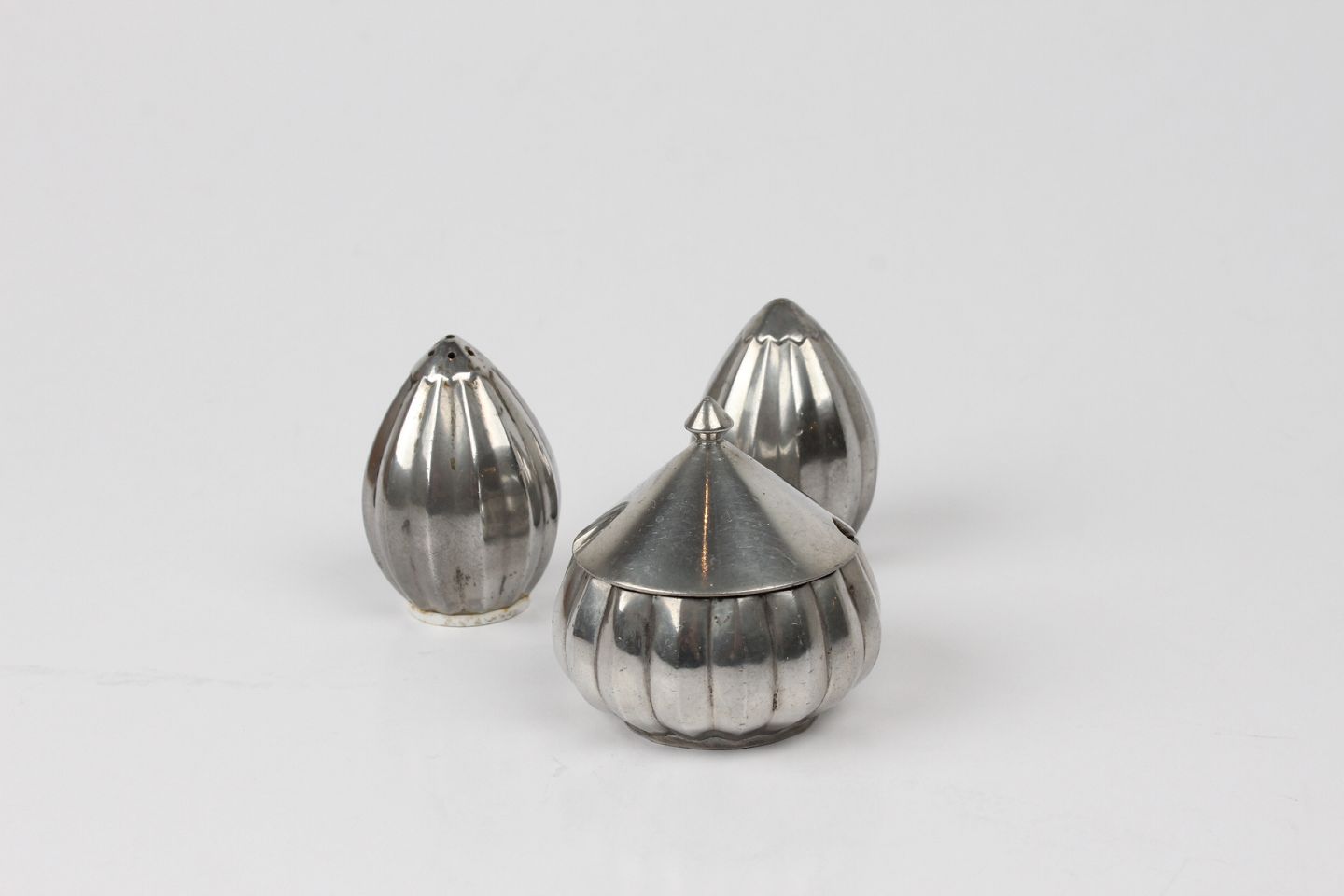 Just Andersen - Danmark Fint lille tin sæt salt, pebber og sennepskrukke Sennepskrukken er med glasindsats i blådt Sign. Just A Danmark Højde 5,5 cm Fin stand efter almindelig brug