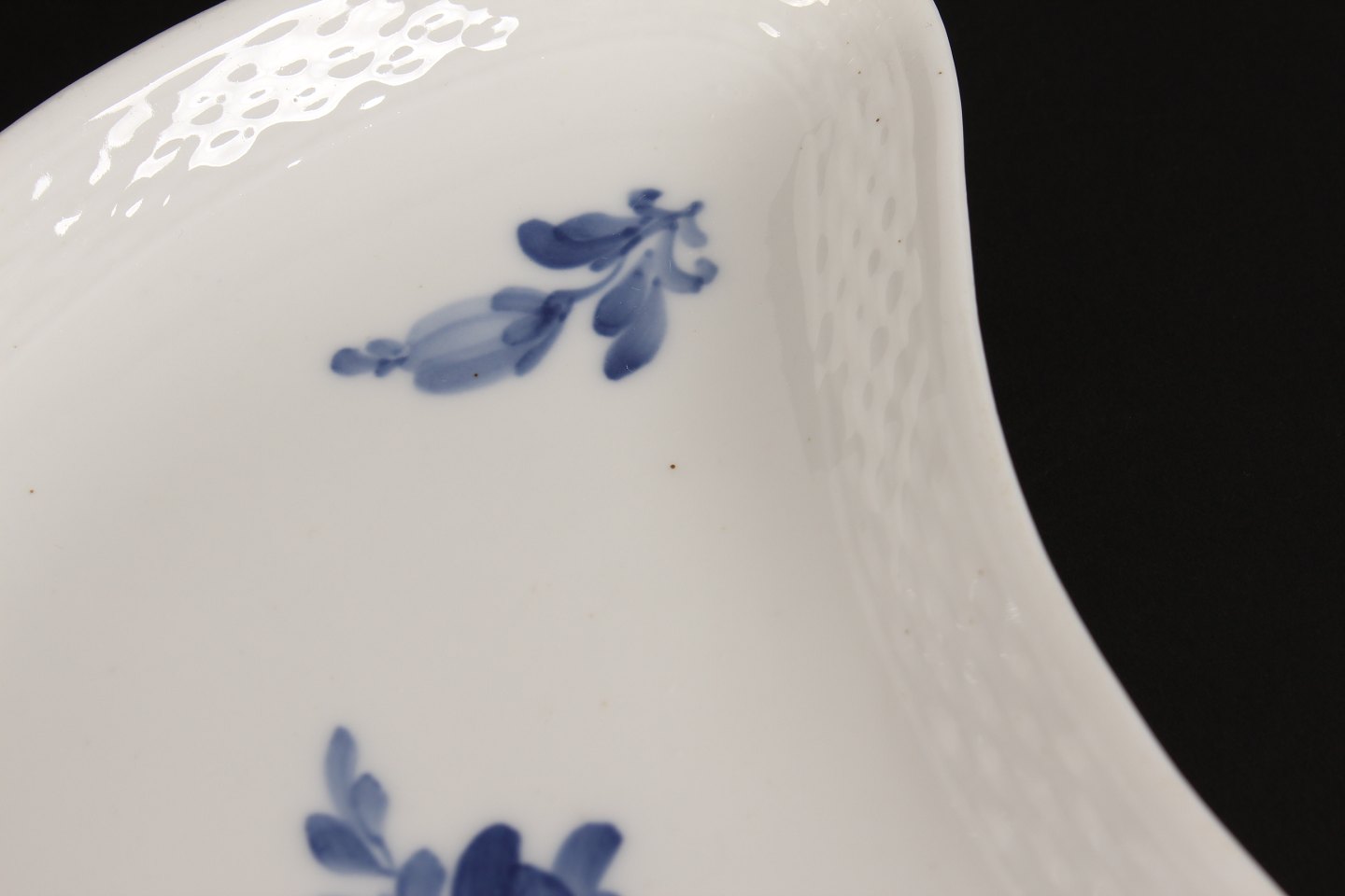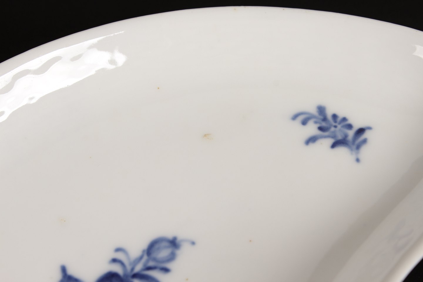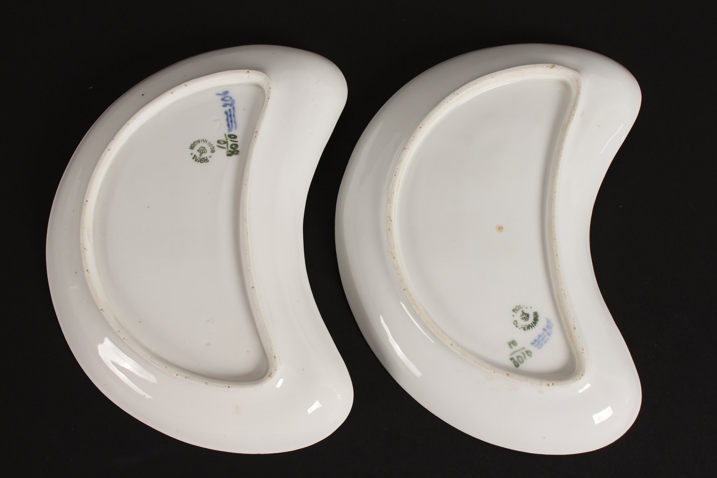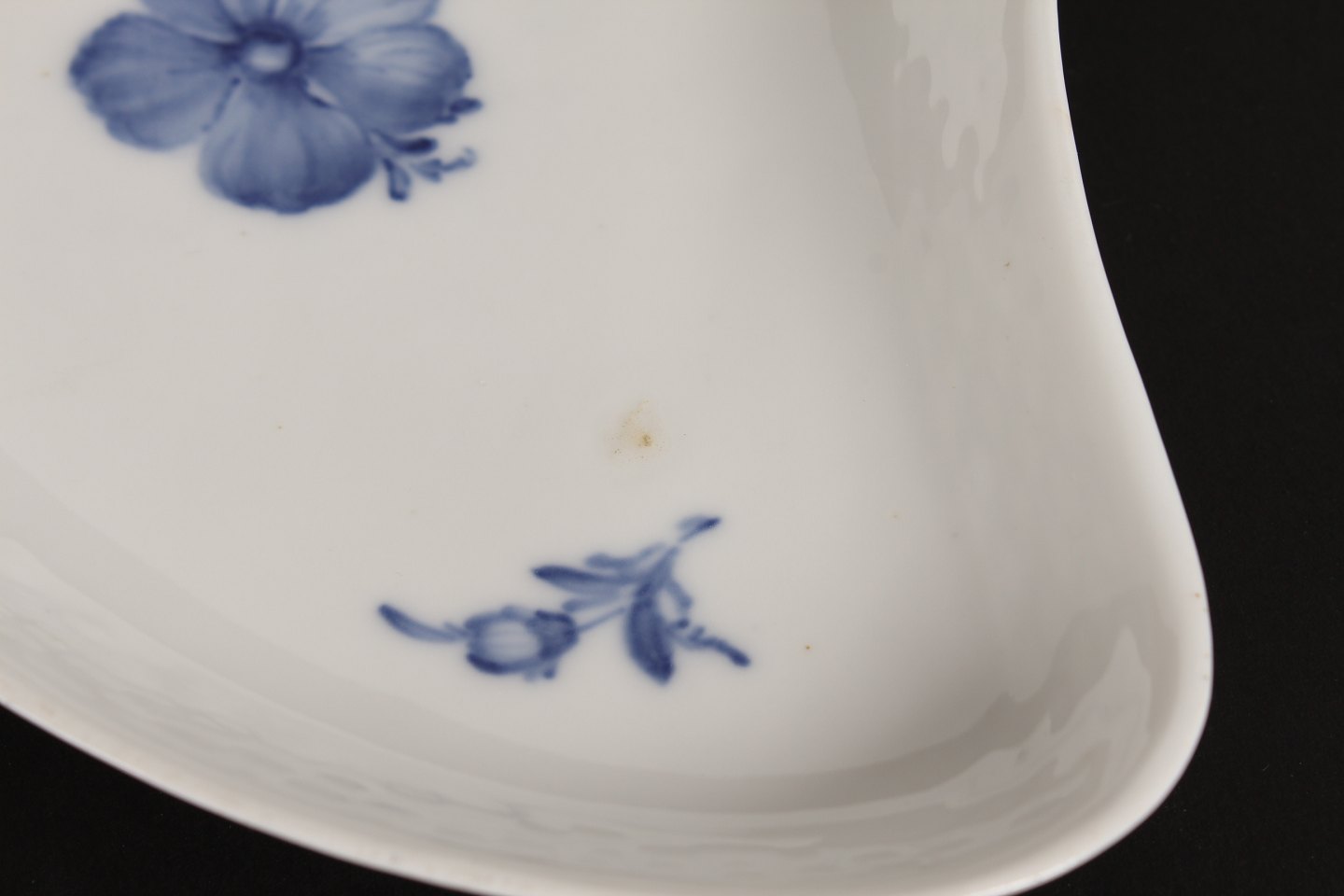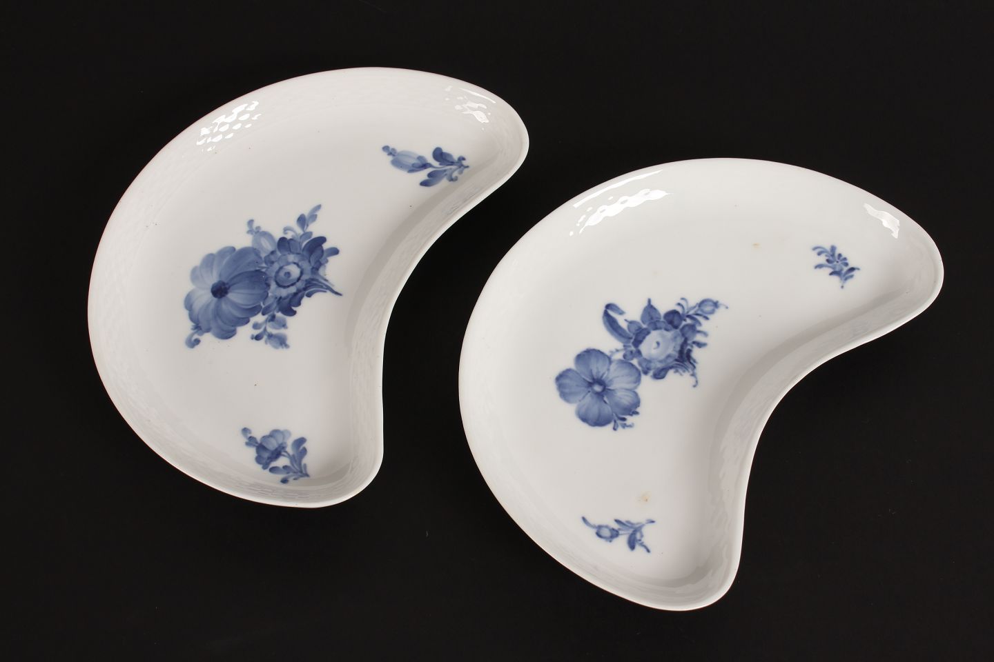 Royal Copenhagen Blå Blomst flettet Halvmåne formet assiet nr. 8010 Længde 21,5 cm Med stempel fra perioden 1894-1023 2. sortering i fin stand uden skår Se billeder af små nister i glasuren