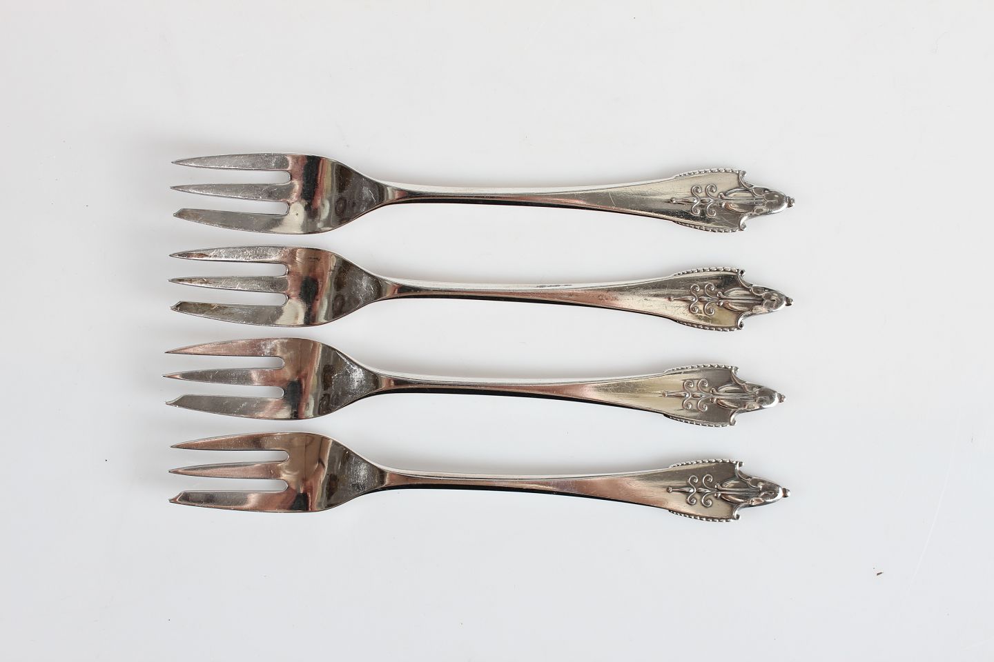 Georg Jensen (1866-1935) Akeleje sølvbestik af sterling sølv 925s Tegnet af Georg Jensen i 1918 Kagegafler Længde 14 cm Fin stand uden gravering