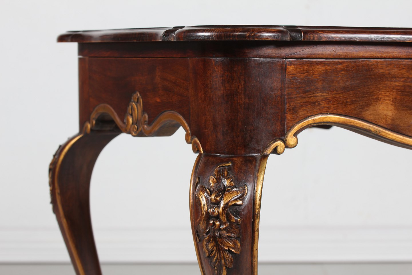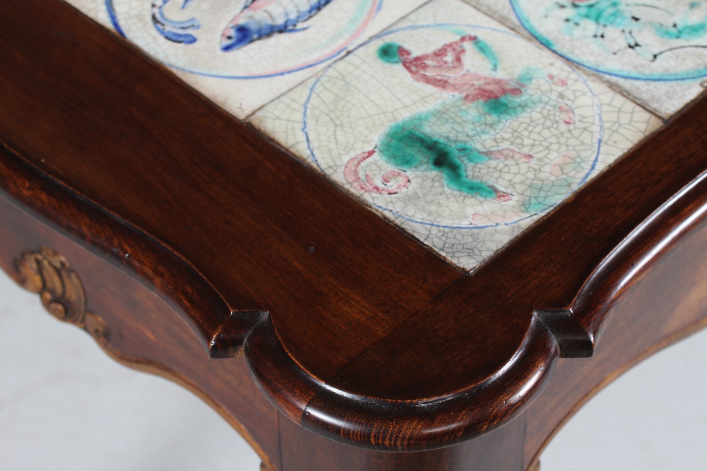 Rococo style tile-top table Tile-top table from 1930´s made of wood with gilded carvings With tiles from Kähler designed by Jens Tirslund (1892-1942) Height 75 cm Length 101 cm Width 61 cm Nice vintage condition
