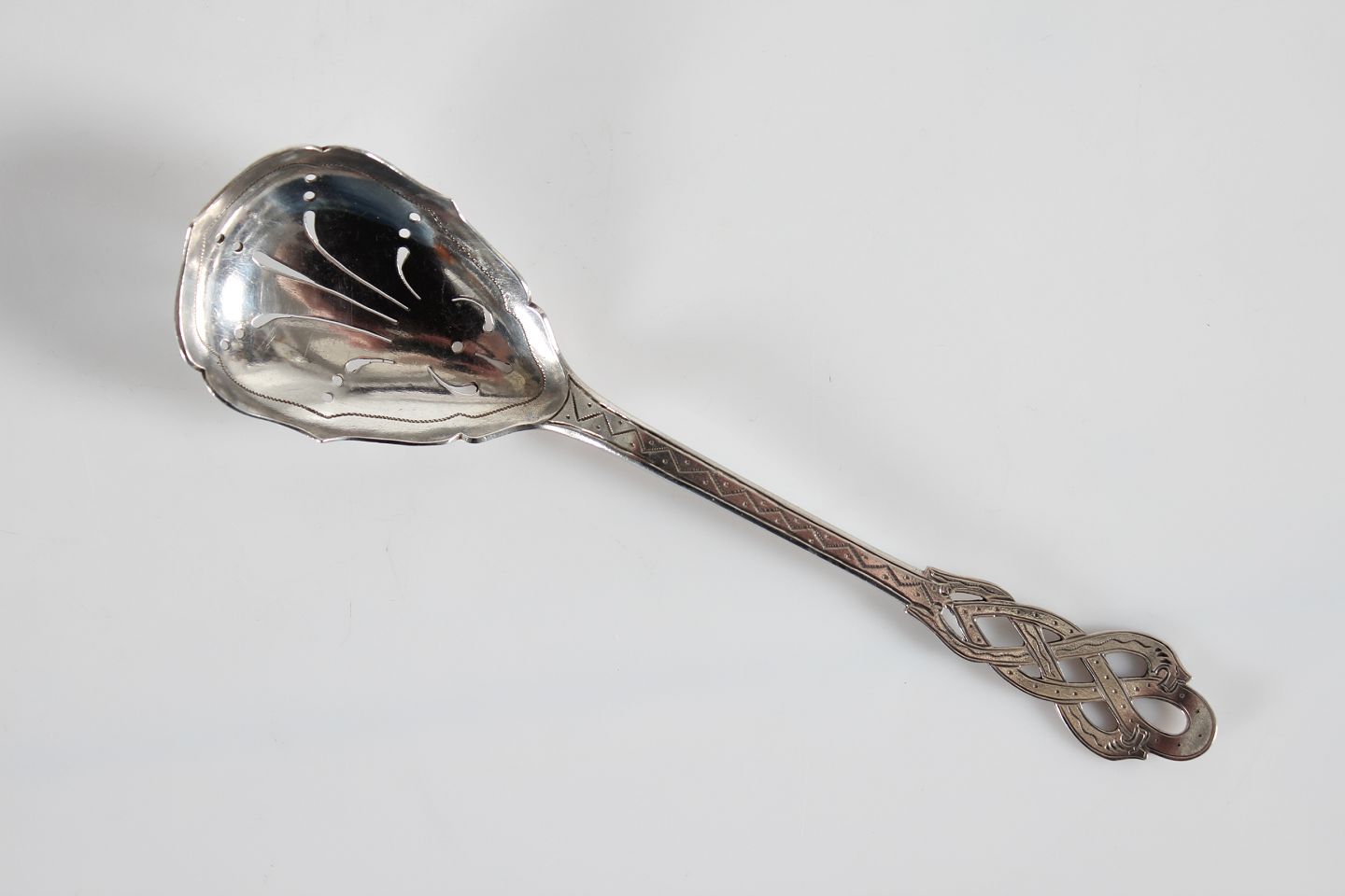 Dansk Sølvsmed Tretårnet jordbærske fra Grønlund, Odense med gennembrudt mønster Med stempel fra 1904 Længde 19 cm Fin stand uden monogram