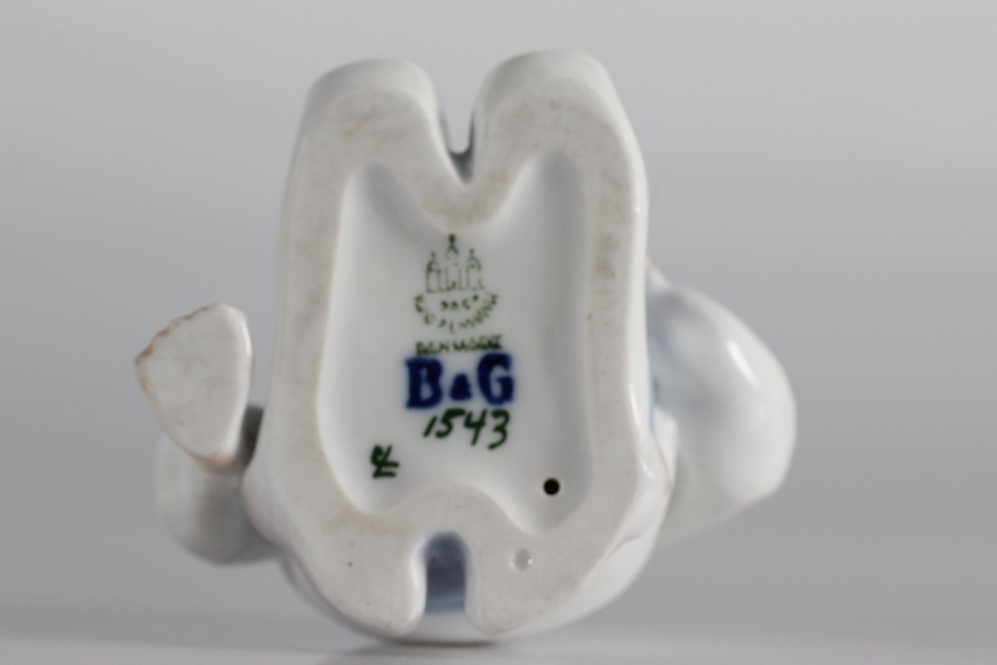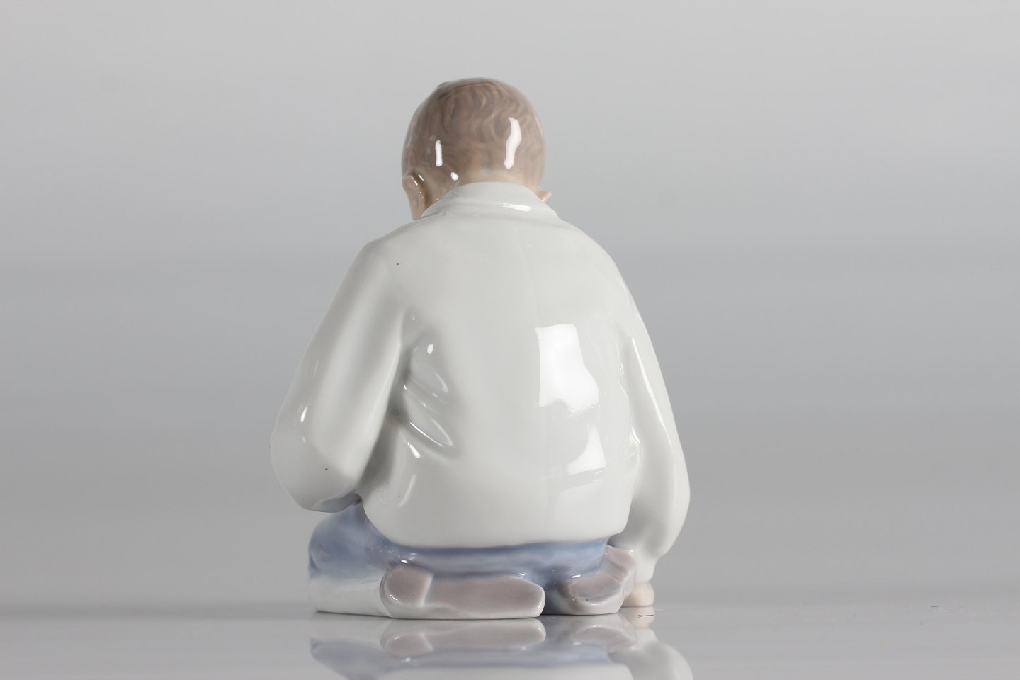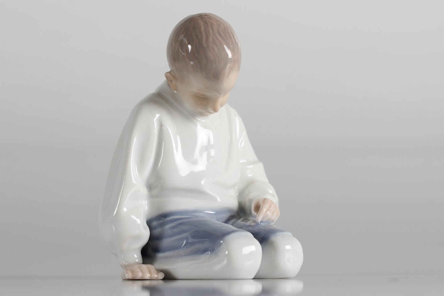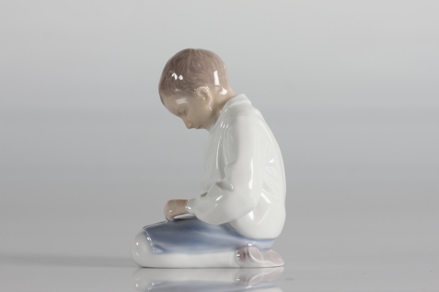 Bing & Grøndahl Figurer Porcelænsfigur filosoferende dreng nr. 1543 med tidlig lys blå dekoration Med stempel fra perioden 1915-47 Højde 9 cm Fin fejlfri 1. sortering