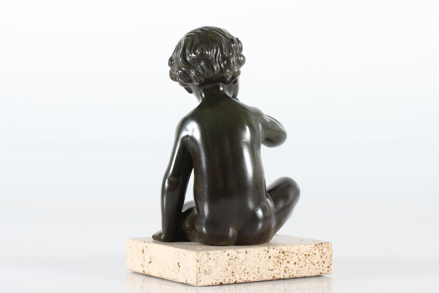 Just Andersen Nøgen dreng af patineret disco metal D 2326 siddende på marmorsokkel Formgjort af Just Andersen 1942 Højde 21,5 cm incl sokkel Fin stand og patinering - se foto med en ganske lille ridse i panden