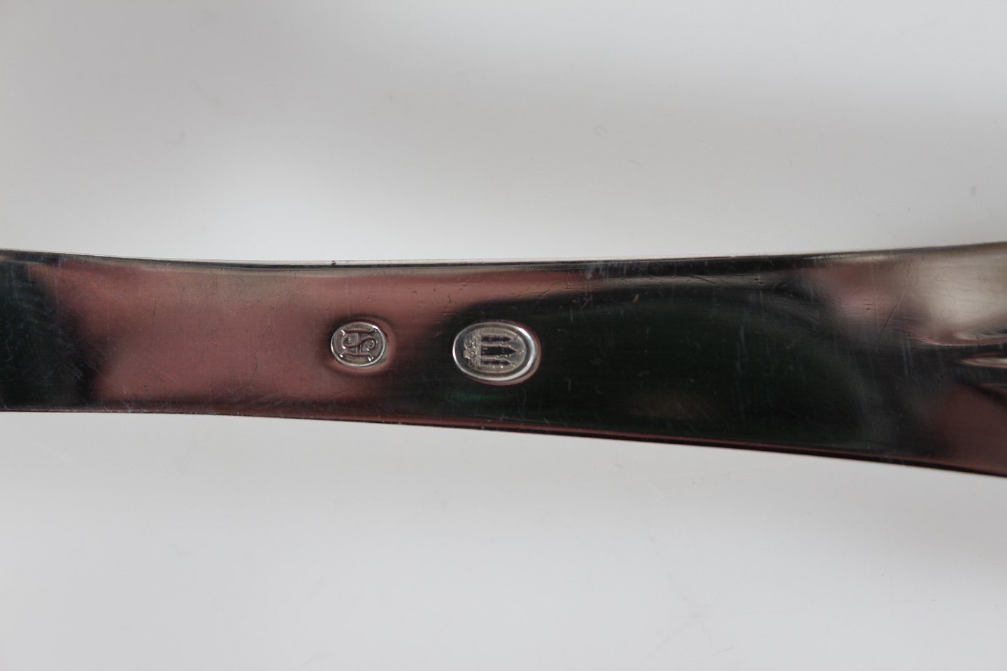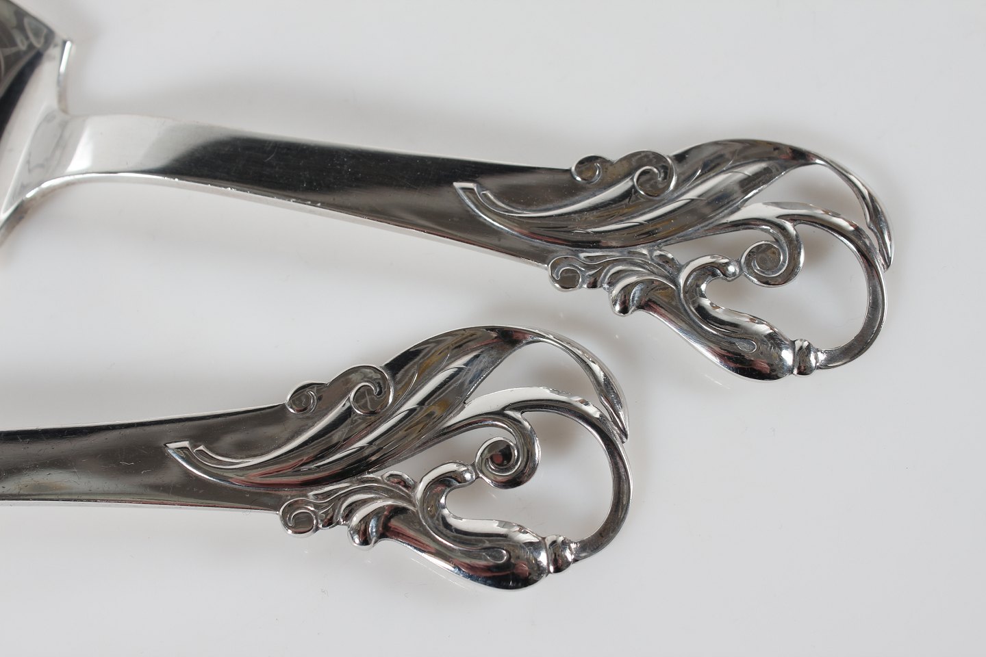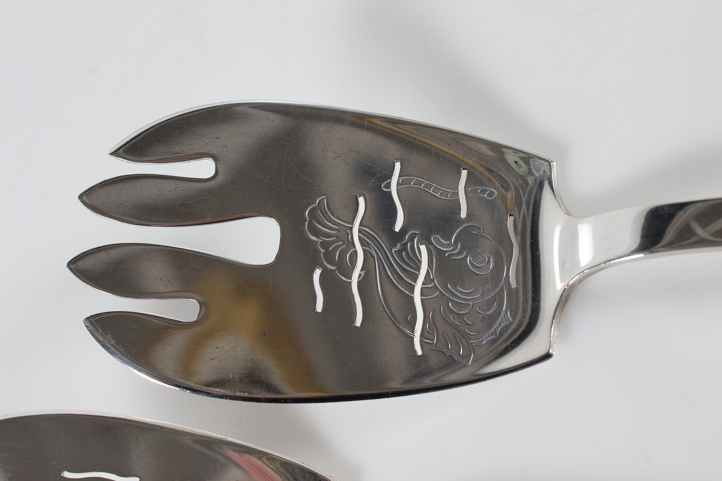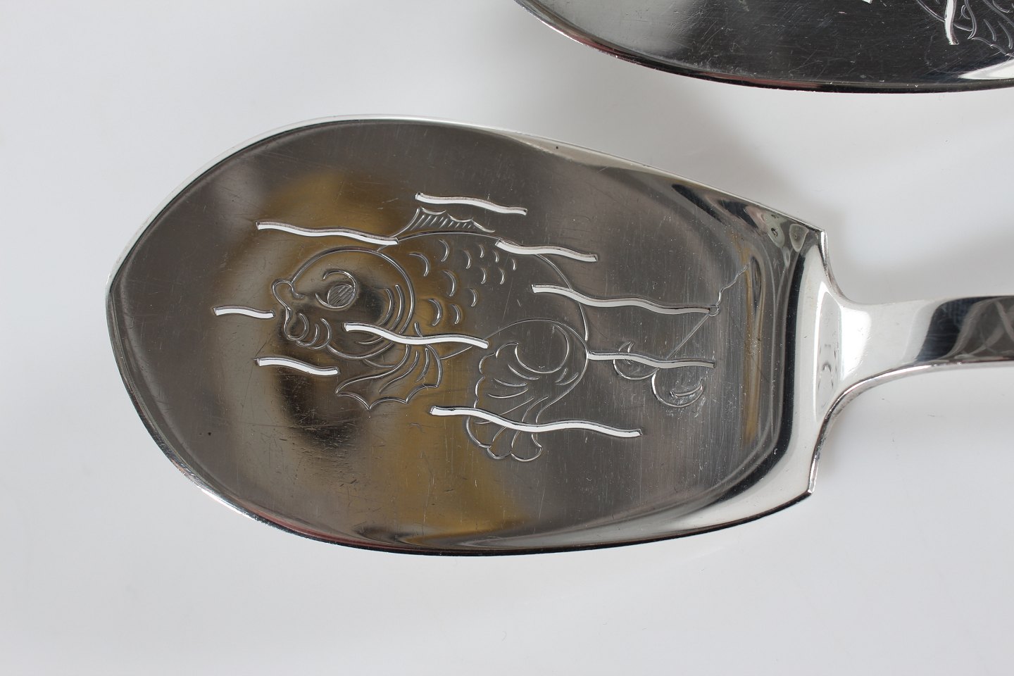 Dansk Sølvsmed Tretårnet fiskeserveringssæt med håndgraverede fisk og planter Med stempel fra 1959 Længde 21,5 cm Fin stand uden monogram