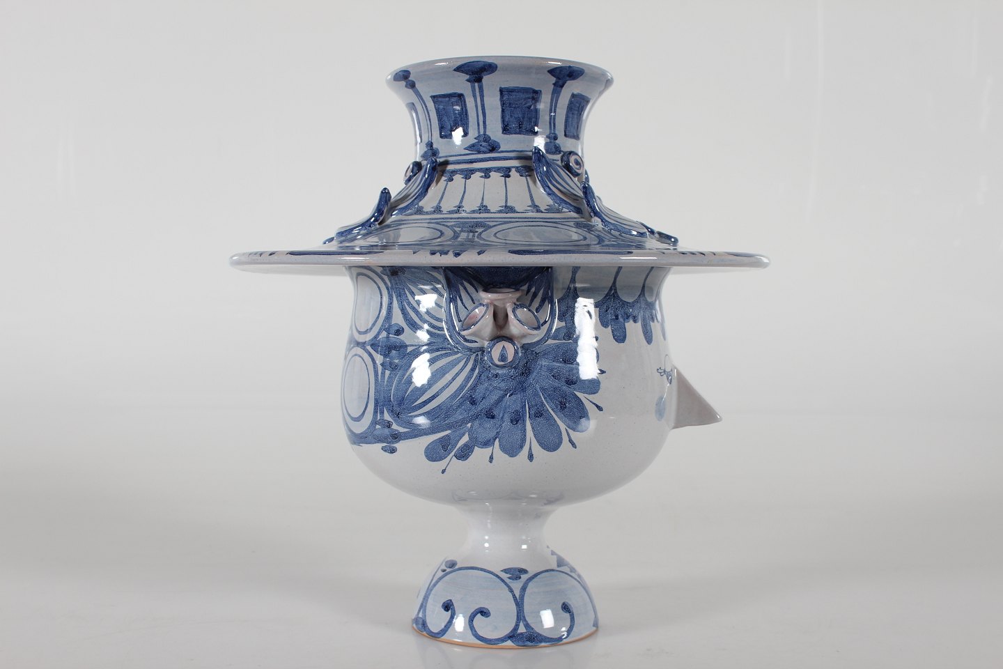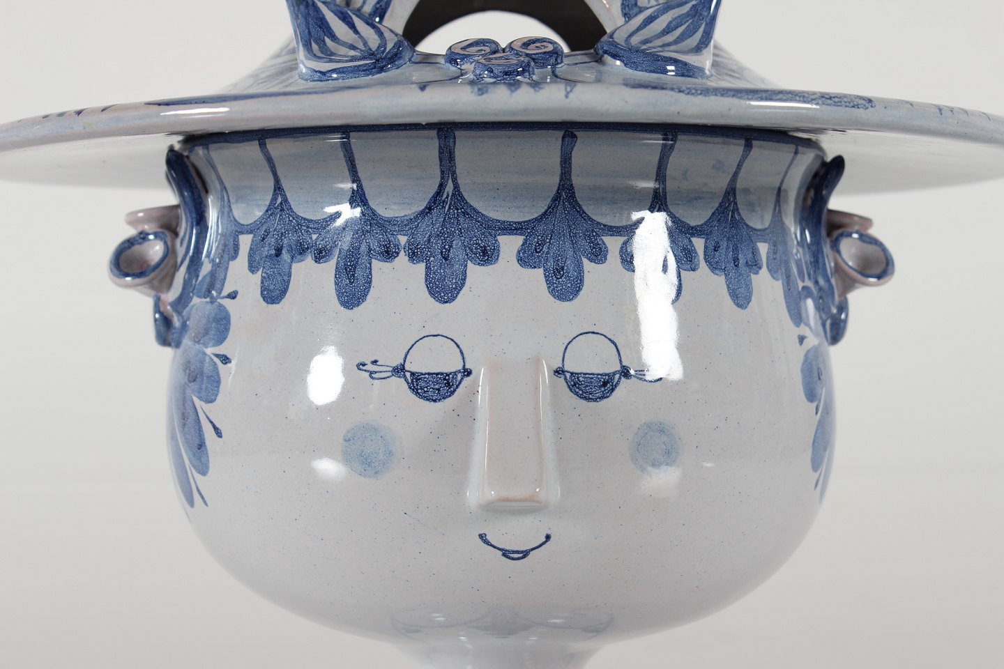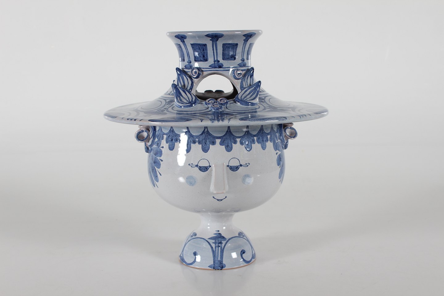 Bjørn Wiinblad - Det Blå Hus Stor lågkrukke udformet som kvindehoved nr. V 52 med håndmalet blå dekoration med lyserød islet Dette eksemplar er fra 1979 - Danmark Højde 31 cm Diameter 30 cm Fin stand uden skår eller revner