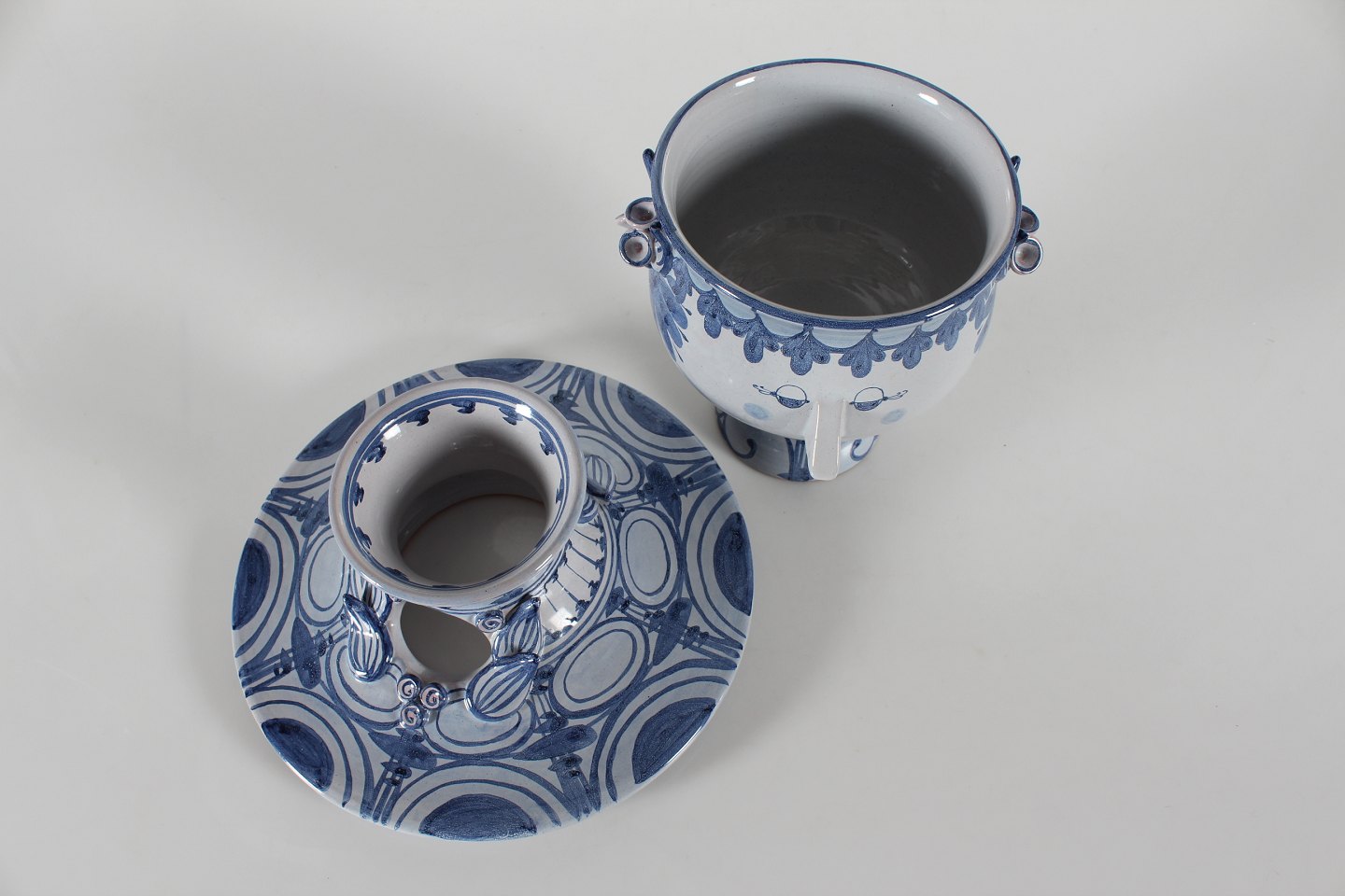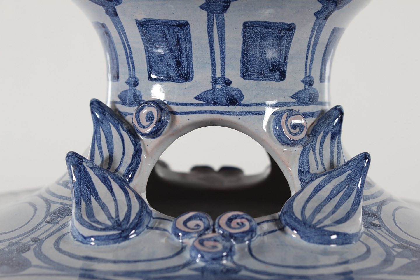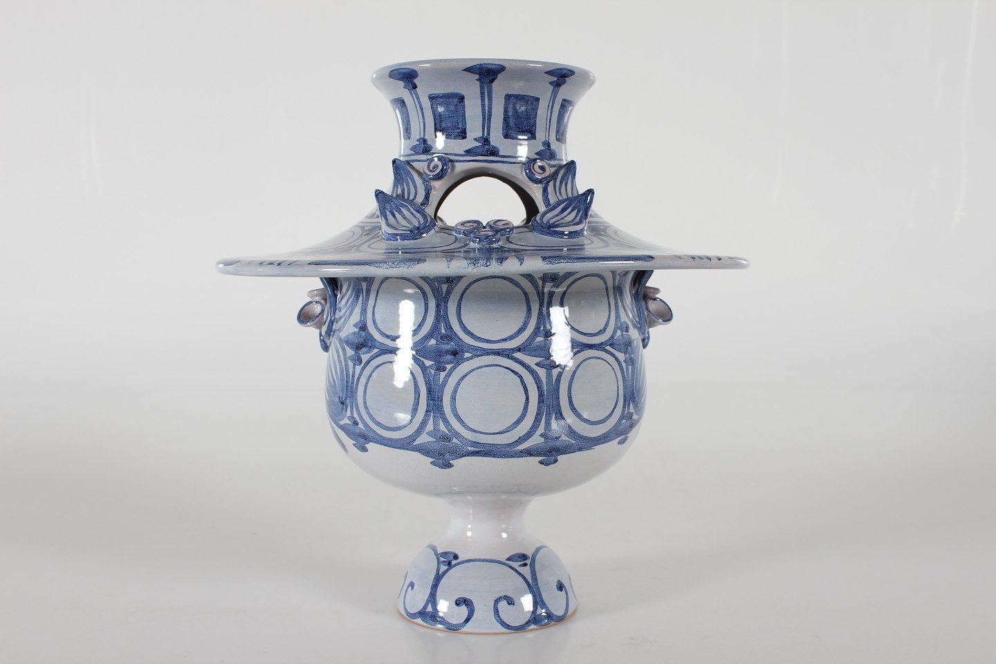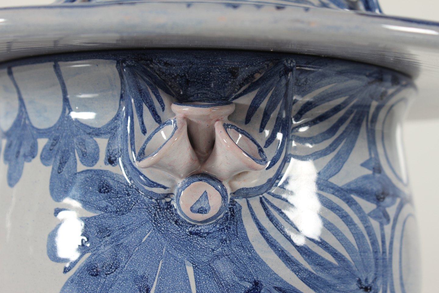 Bjørn Wiinblad - Det Blå Hus Stor lågkrukke udformet som kvindehoved nr. V 52 med håndmalet blå dekoration med lyserød islet Dette eksemplar er fra 1979 - Danmark Højde 31 cm Diameter 30 cm Fin stand uden skår eller revner