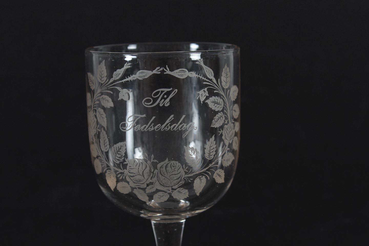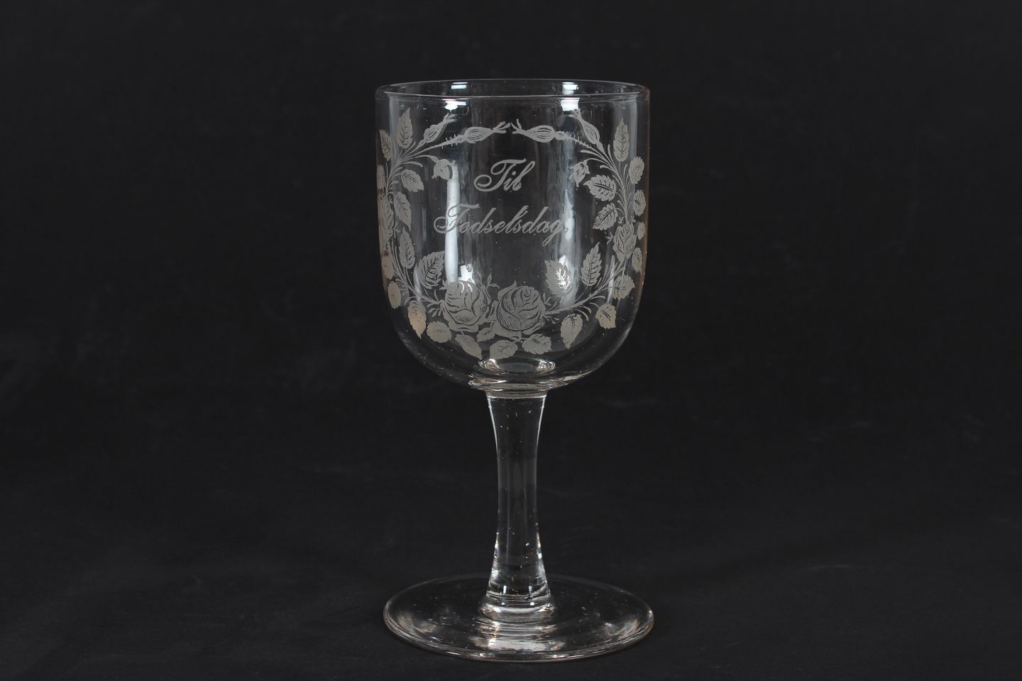 Gammel erindringsglas fra Kastrup Glasværk Med ætset påskrift "Tii Fødselsdag" Højde 15,5 cm Diameter 7 cm Fin stand
