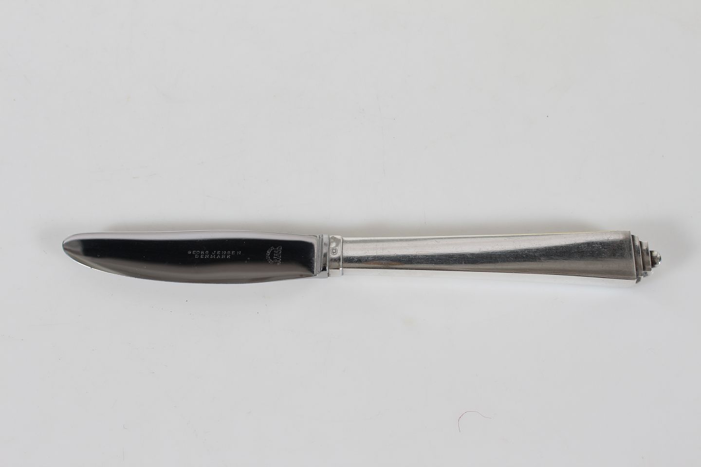 Georg Jensen Sølv Pyramide bestik tegnet af Harald Nielsen 1927 Middagsknive med langt skaft Længde 22,5 cm Fremstillet af sterling sølv Med stempel fra perioden efter 1945 Fin stand uden indgravering eller lign.