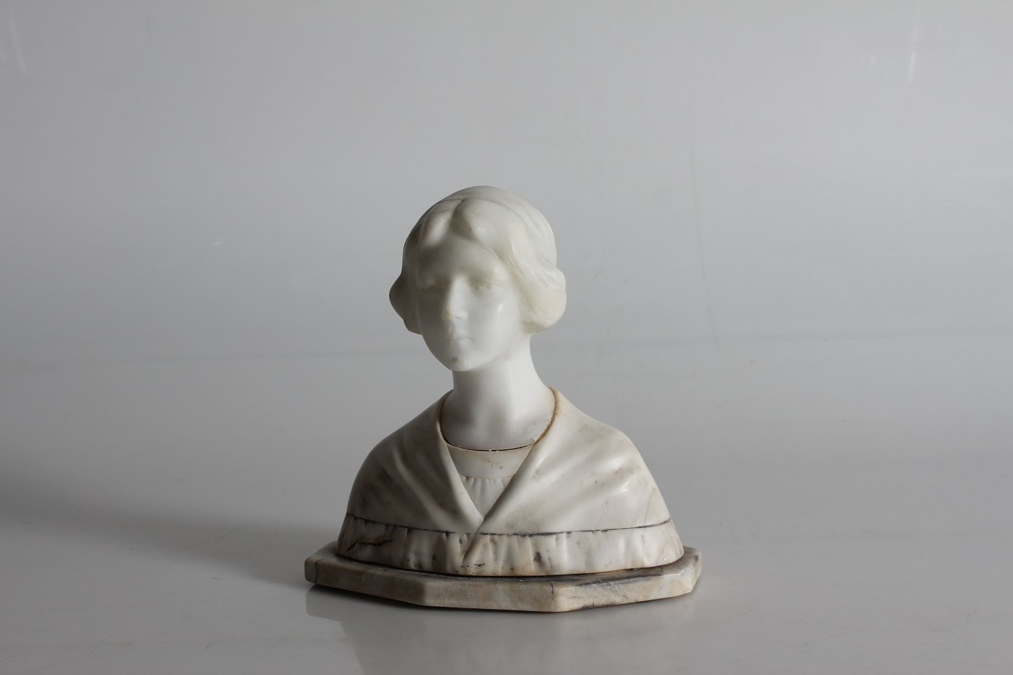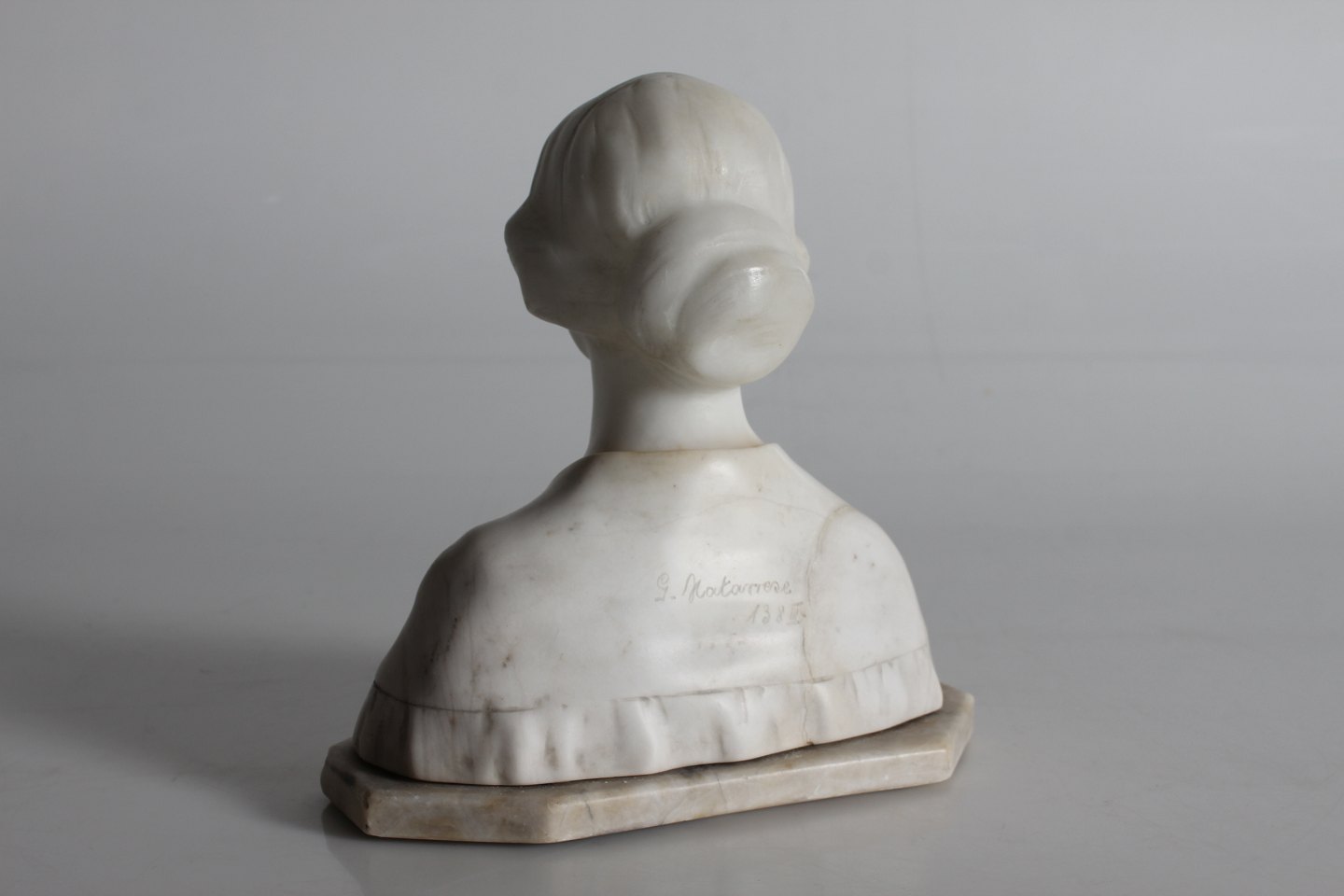 G. Matarrese Figurine of marble Bust of a young woman made 1850-1900 Signed G. Matarrese Height 20 cm Længde 20 cm Bredde 11 cm Nice vintage condition - see photos of small repair